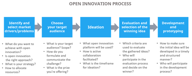 Het doel van open innovatie is om de kwaliteit en snelheid van ontwikkeling te verbeteren. Succesvolle resultaten hebben de neiging om een systematisch uitgevoerd proces te volgen . Om ook de massa aan informatie te kunnen begrijpen, is een solide proces noodzakelijk.