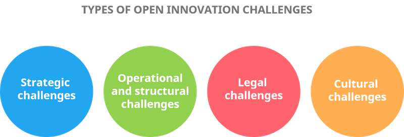 De meest voorkomende uitdagingen van open innovatie kunnen worden onderverdeeld in vier categorieën: strategische, operationele, wettelijke en culturele aspecten .