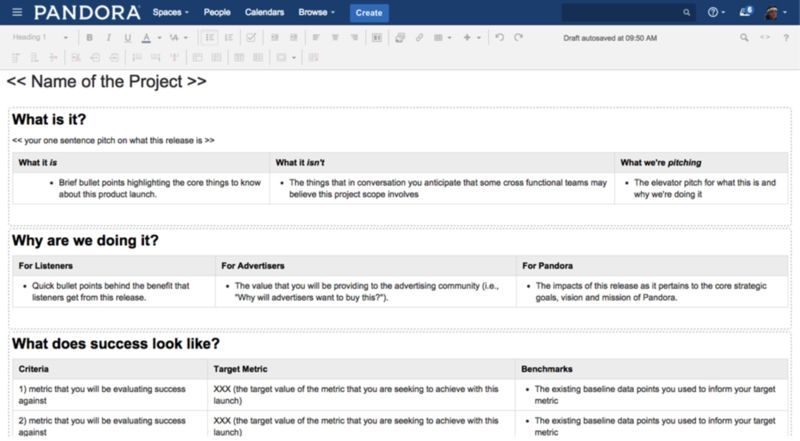 Plan-document lanceren : een samenstel van alle operationele planningsdocumenten om alle inspanningen tussen alle teams te coördineren, inclusief productbeheer, verkoop, marketing en ontwikkeling. Dit werd iets meer dan twee jaar geleden aangenomen vanwege de schaal van Pandora.